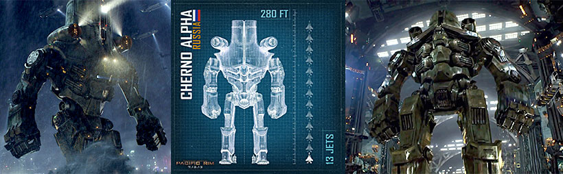 เมื่อเจาะลึกลงไปที่การออกแบบ jaeger ผมอนุมานเอาว่าคนดูทางฝั่งเอเชียรวมทั้งผมเองคุ้นเคยกับการออกแบบเครื่องจักรทางฝั่งญี่ปุ่น ที่มีรายละเอียด แต่งองทรงเครื่องกันเยอะแยะอยู่แล้ว ดังนั้น gipsy danger ที่เป็นหุ่นแบบอเมริกันจึงทำให้ผมรู้สึกเฉยๆไปในทันที จากการที่ขาดรายละเอียดของตกแต่งเน้นแค่มีอวัยวะครบ เนื่องจากพยายามยึดการออกแบบดั้งเดิมในสไตล์อเมริกันเอาไว้ (การออกแบบที่ไม่เน้นรายละเอียด ตรงๆทื่อๆดิบๆ แบบที่เห็นกันมาตั้งแต่ยุคต้นๆศตวรรษที่ 20 หุ่นที่อธิบาย concept นี้ได้ดีคือหุ่นจากเรื่อง iron giant) ส่วน striker eureka ของออสเตรเลียก็มีความเป็นญี่ปุ่นอยู่เต็มไปหมด (angel wings ที่หลังนั่นไง ผมดูแล้วนึกถึง patlabor ขึ้นมาทันที) กลายเป็นอะไรที่ชินตาไปอย่างรวดเร็ว ตรงกันข้ามกับ cherno alpha หุ่นรูปทรงประหลาด ปนพิลึกตัวนี้กลับดูมีเสน่ห์ขึ้นมา ชนิดที่กลายเป็นขวัญใจของใครหลายๆคนไปในทันทีที่พบ หากเจาะลึกลงไปในการออกแบบ cherno alpha จะพบว่าทีมงานออกแบบมีการทำการบ้านมาดี และหุ่นตัวนี้ซ่อนประวัติศาสตร์อะไรหลายๆอย่างเอาไว้มากมาย