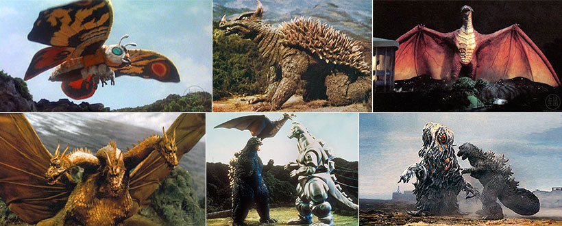 * ตัวอย่างสัตว์ประหลาดยักษ์หรือไคจูหลักๆ ที่ถูกจับมาปะทะกับก็อตซิลล่าภาคพิเศษในเวลาต่อๆมา อาทิ ... แถวบนจากซ้ายตามลำดับ: Mothra, Anguirus, Rodan, - แถวล่างจากซ้าย: