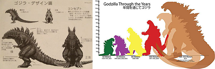 * รูปซ้าย: ว่ากันว่านี่คือต้นแบบ Concept Art สำหรับ ใช้สร้างหุ่น Godzilla 2014 ตัวจริงๆ อันมีคนบังคับอยู่ข้างใน สำหรับใช้กับบางฉากด้วย (นอกจากที่ใช้ CG เป็นหลัก) ทั้งนี้ก็เพื่อความสมจริงของเนื้อหนัง ... ส่วนผังทางขวานั้นแสดงให้เห็นว่า Godzilla ตัวโตขึ้นเรื่อยๆในหนังภาคใหม่ๆ และสำหรับ 2014 ล่าสุดมันมีขนาดสูงถึง 120-150 เมตร!